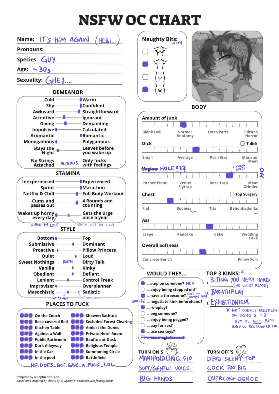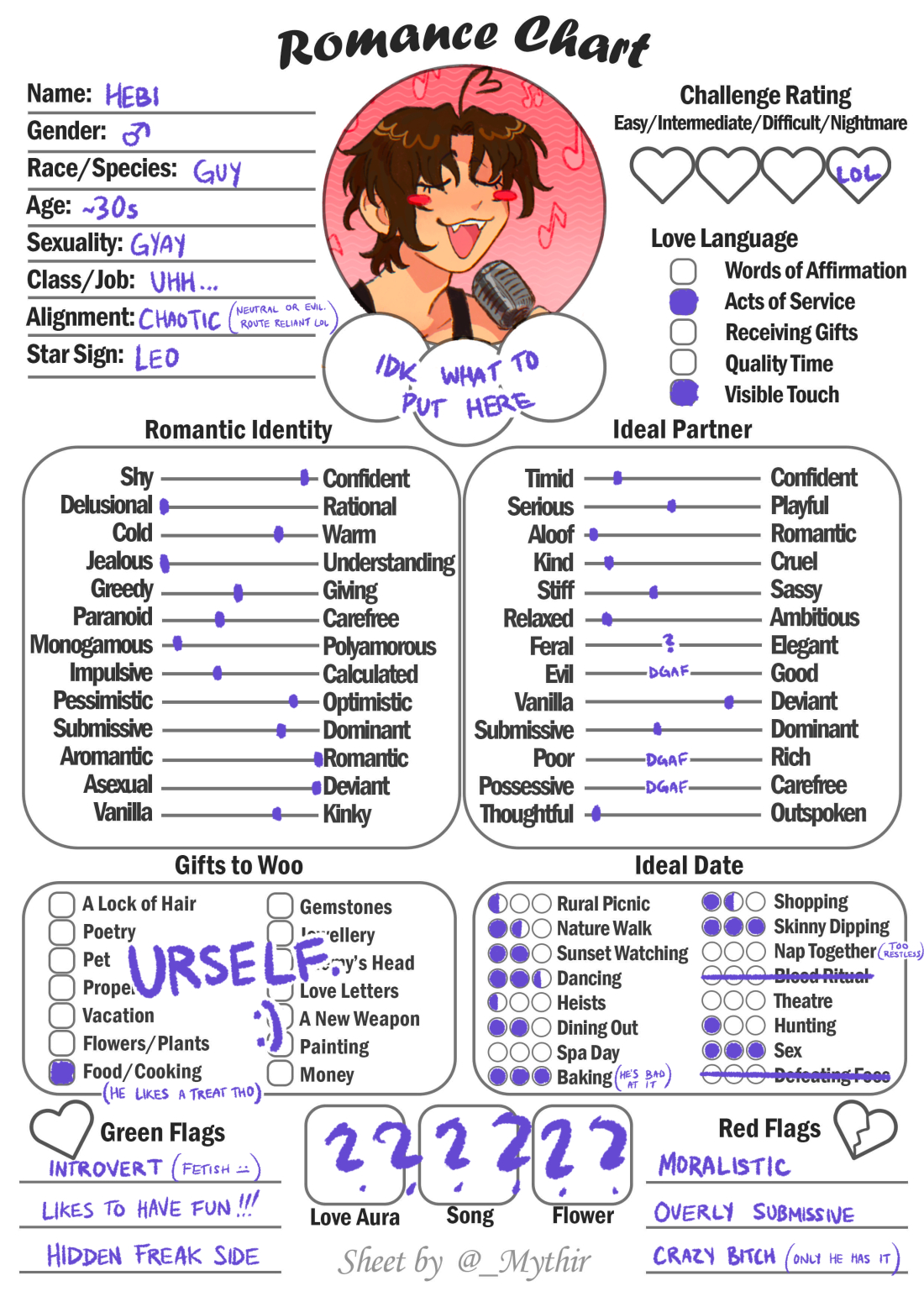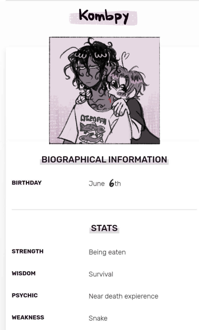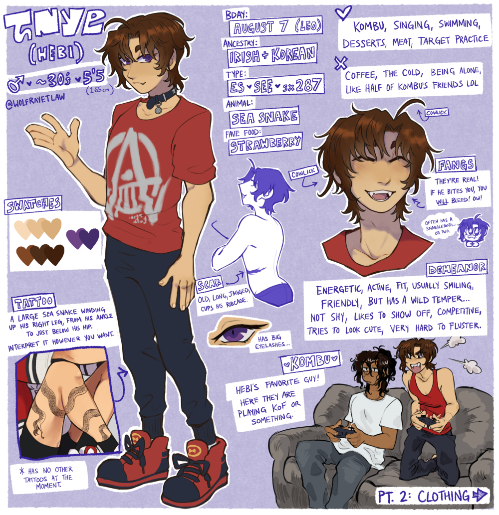 He probably has a lot of pet peeves, but I can't think of too many rn... Specifically, I know he gets extremely annoyed by anyone who's too similar to him in personality (someone who often offers to help, tries to be the funny one, crazy bitch etc). He needs to be the only Hebi guy in the room.